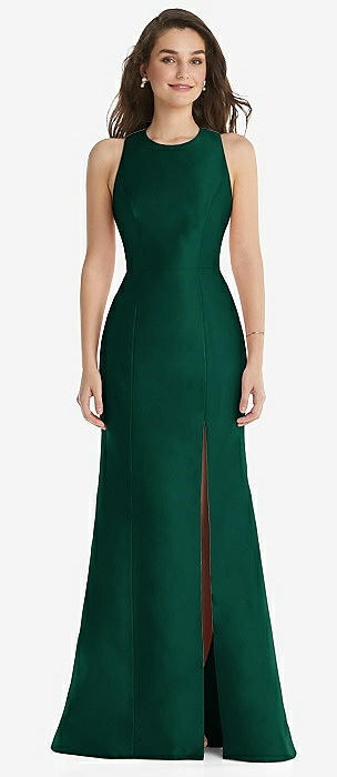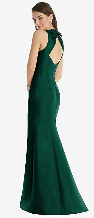 Jewel Neck Bowed Open-Back Trumpet Dress with Front Slit in hunter green