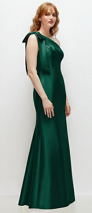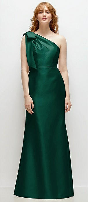 Bow One-Shoulder Satin Trumpet Gown in hunter green