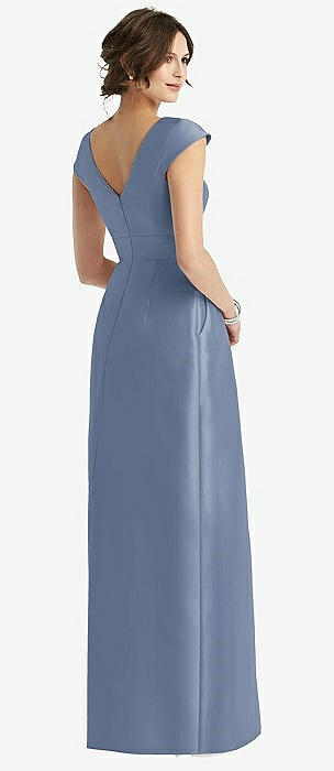 Jewel Neck Bowed Open-Back Trumpet Dress with Front Slit in larkspur blue
