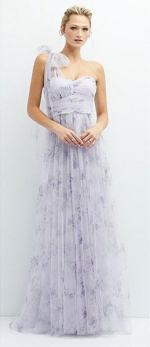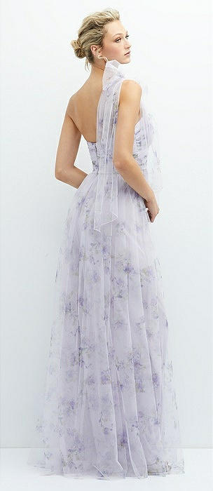 Floral Scarf Tie One-Shoulder Tulle Dress with Long Full Skirt in lilac haze garden