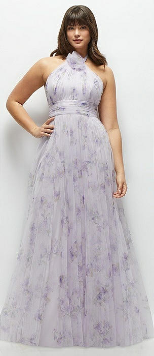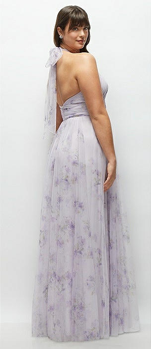 Floral Tie-Back Halter Tulle Dress with Long Full Skirt & Rosette Detail in lilac haze garden