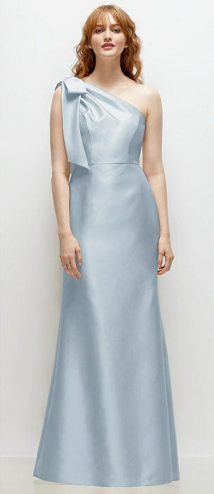 Cascading Bow One-Shoulder Stretch Satin Mermaid Dress with Slight Train in mist