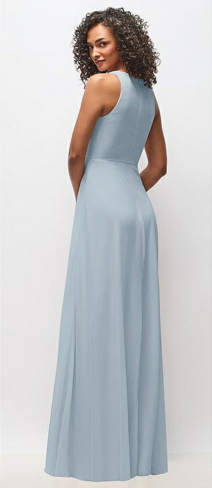 Shirred Skirt Jewel Neck Halter Dress with Front Slit in mist