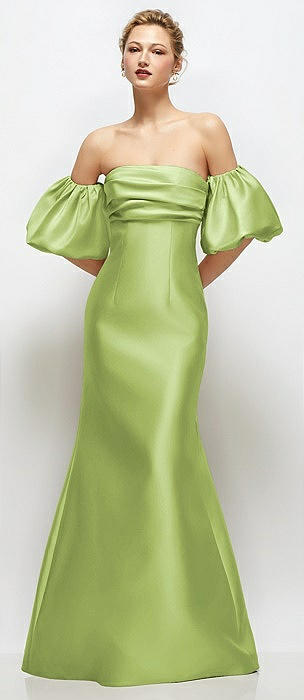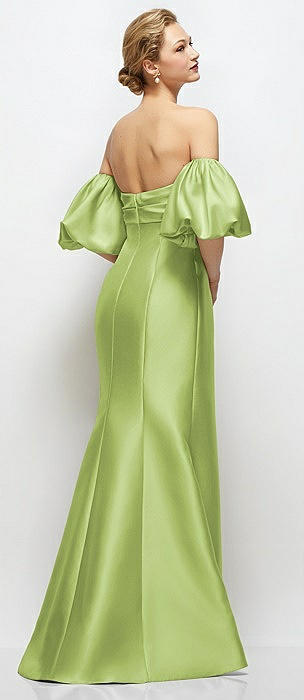 Off-the-Shoulder Puff Sleeve Satin Maxi Dress with Flared Skirt in mojito
