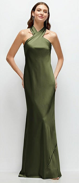 Pleated Halter Bias Satin Maxi Dress with Self-Tie Bow Back in olive green