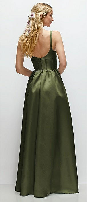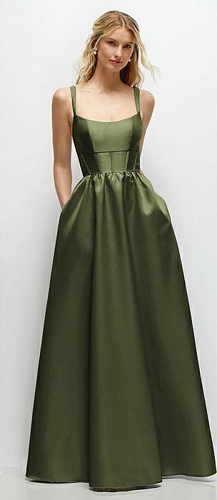 Scoop Neck Inset Corset Satin Maxi Dress with Pockets in olive green