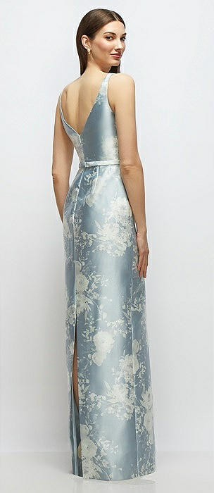 Floral Bateau Neck Satin Column Dress with Bow-Trimmed Skinny Belt in porcelain blue seraphina floral