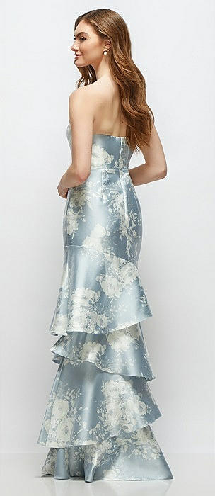 Floral Strapless Bodycon Maxi Dress with Tiered Ruffle Skirt in porcelain blue seraphina floral