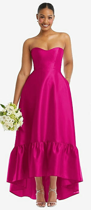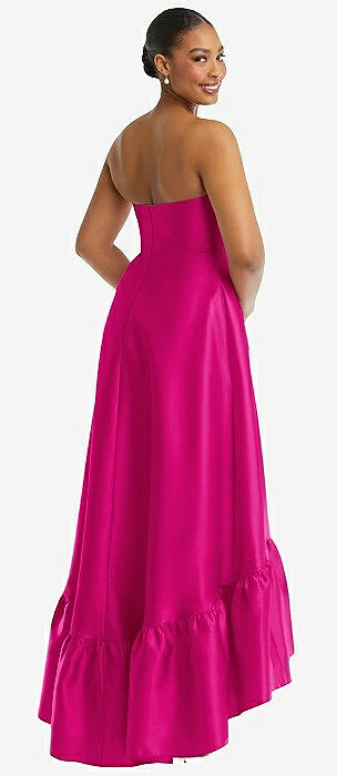 Strapless Deep Ruffle Hem Satin High Low Dress with Pockets in think pink