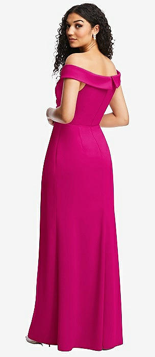 Cuffed Off-the-Shoulder Pleated Faux Wrap Maxi Dress in think pink