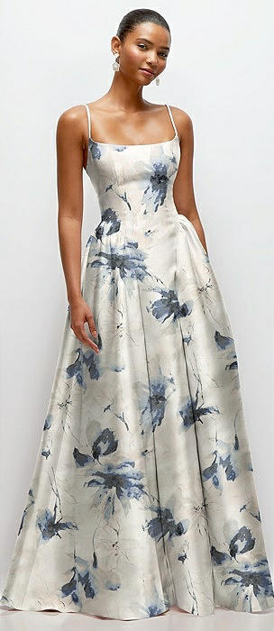 Floral Strapless Satin Drop Waist Gown with Full Skirt in inkwash blue floral