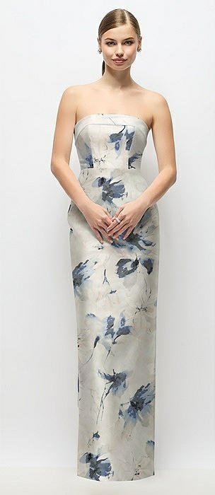 Strapless Floral Satin Column Dress with Removeable Watteau Train in inkwash blue floral
