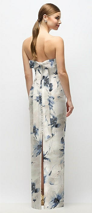 Strapless Floral Satin Column Dress with Back Slit in inkwash blue floral
