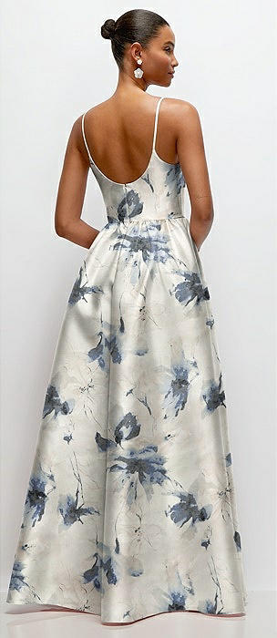 Soft yet striking, our inkwash blue floral bridesmaid dresses bring a modern, artistic romance to your bridal party look. The creamy backdrop sets the tone for dreamy watercolor florals in soft gray, warm blush, and moody ink blue—like a hand-painted canvas brought to life. Perfect for the bride who loves an art-inspired moment, this blue floral satin hits the perfect mix of chic, dreamy, and completely unforgettable.