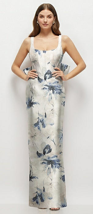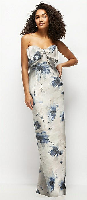 Floral Strapless Draped Bodice Column Dress with Oversized Bow in inkwash blue floral