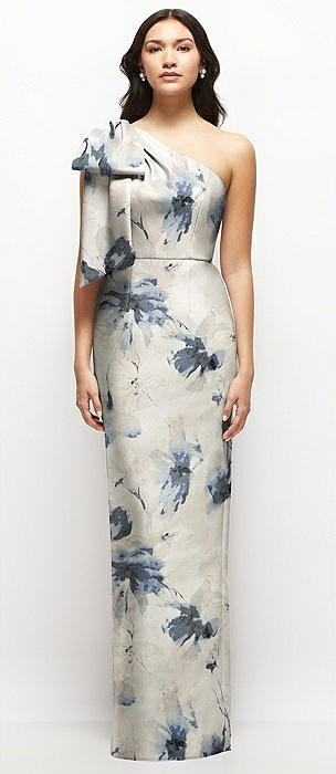 Oversized Bow One-Shoulder Floral Satin Column Maxi Dress in inkwash blue floral