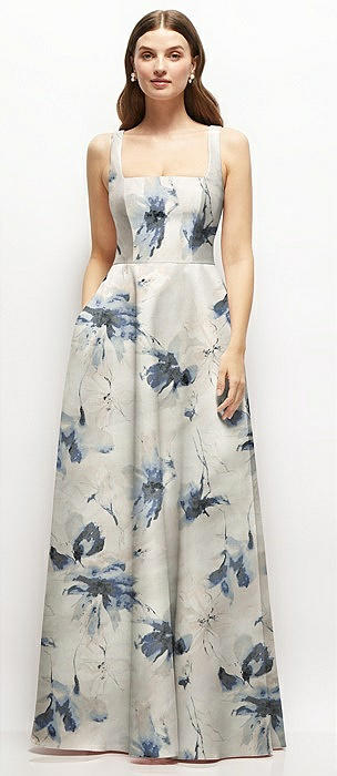 Floral Square-Neck Satin Maxi Dress with Full Skirt in inkwash blue floral