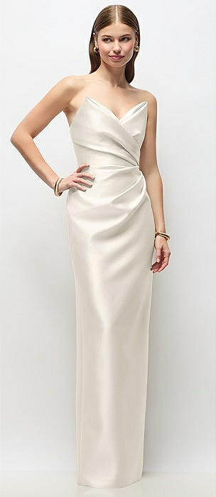 Strapless Asymmetrical Draped Satin Column Maxi Dress in ivory