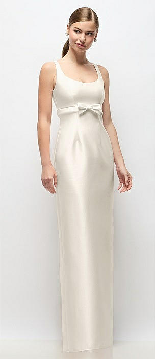 Scoop Neck Satin Column Maxi Dress with Bow at Empire Waist in ivory