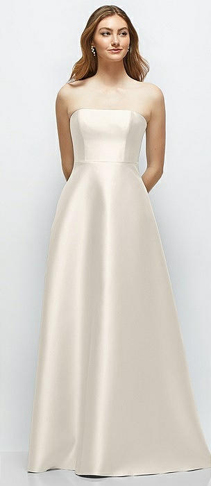 Strapless Bias Cuff Bodice Satin Gown with Pockets in ivory