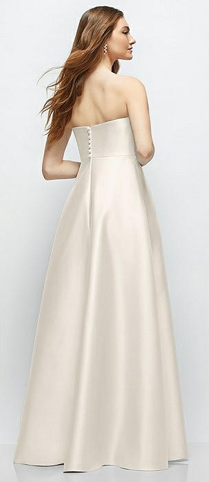 Strapless Satin Gown with Full Skirt and Covered Buttons at Back in ivory
