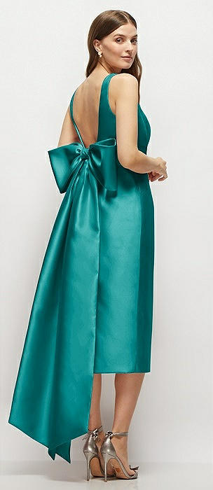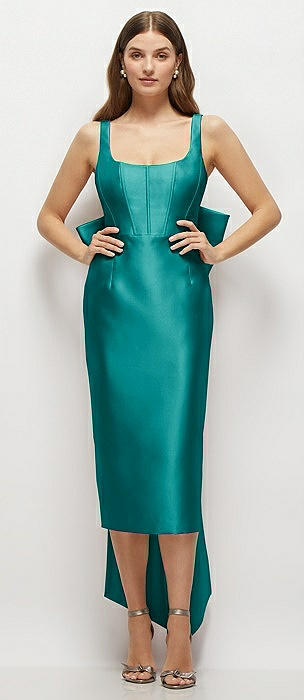 Scoop Neck Corset Satin Midi Dress with Floor-Length Bow Tails in jade