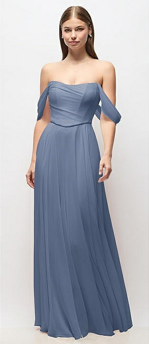 Off-the-Shoulder Basque Corset Chiffon Maxi Dress in larkspur blue