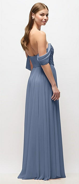 Strapless Chiffon Maxi Dress with Asymmetrical Ruched Drop Waist in larkspur blue