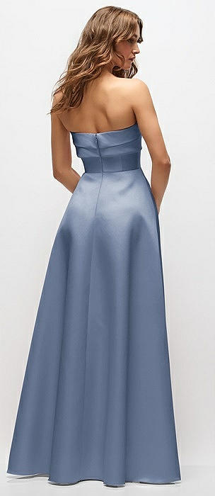 Strapless Satin Gown with Full Skirt and Covered Buttons at Back in larkspur blue