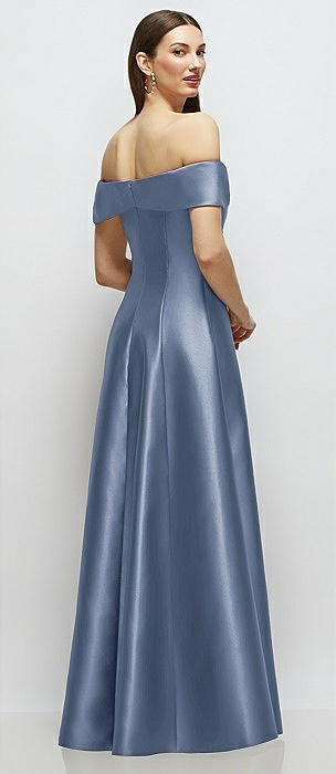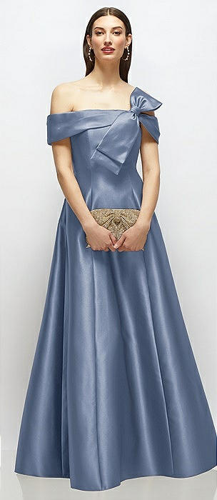 Asymmetrical Bow Off-Shoulder Satin Gown with Ballroom Skirt in larkspur blue