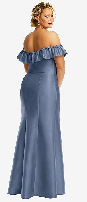 Off-the-Shoulder Ruffle Neck Satin Trumpet Gown in larkspur blue