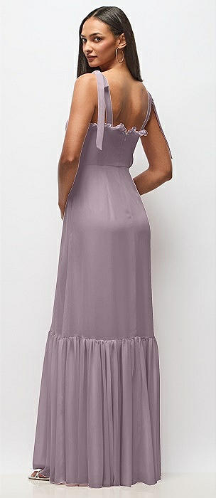 Tie-Shoulder Bustier Bodice Ruffle-Hem Maxi Dress in lilac dusk