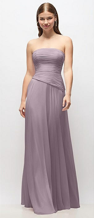 Strapless Chiffon Maxi Dress with Asymmetrical Ruched Drop Waist in lilac dusk