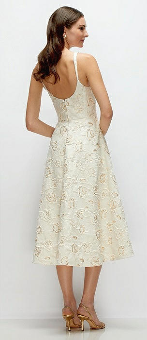 Scoop Neck Ivory Gold Rosette Midi Dress with Horsehair Hem in ivory gold rosette
