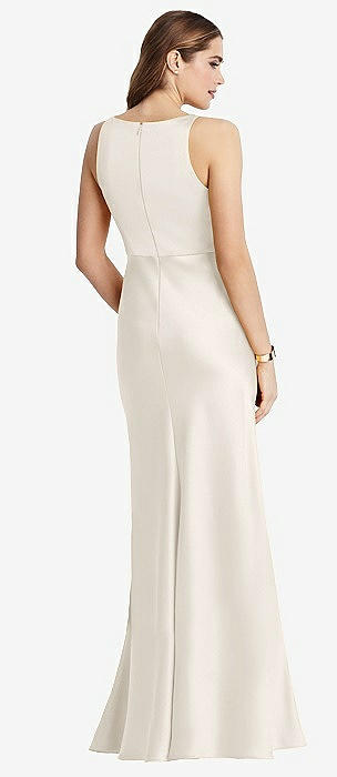Jewel Neck Bowed Open-Back Trumpet Dress with Front Slit in ivory