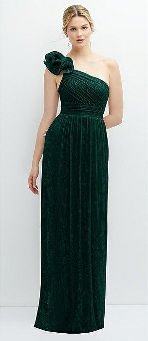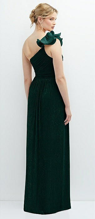 Dramatic Ruffle Edge One-Shoulder Metallic Pleated Maxi Dress
