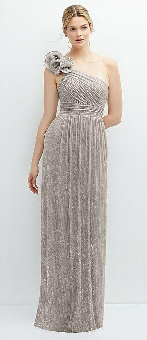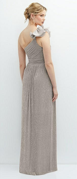 Dramatic Ruffle Edge One-Shoulder Metallic Pleated Maxi Dress