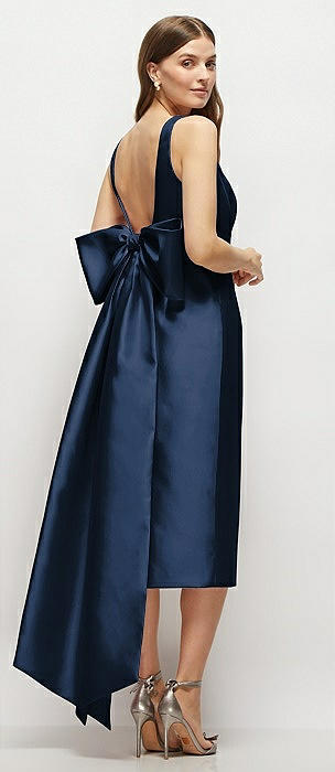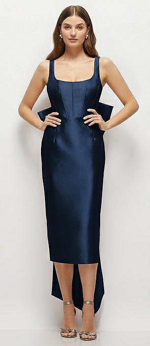 Scoop Neck Corset Satin Midi Dress with Floor-Length Bow Tails in midnight navy