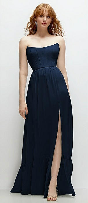 Strapless Cat-Eye Corset Maxi Dress with Ruffle Hem A-Line Skirt in midnight navy