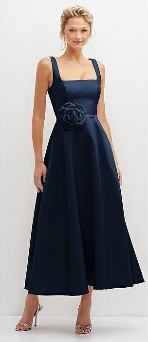 Square Neck Satin Midi Dress with Full Skirt & Flower Sash in midnight navy