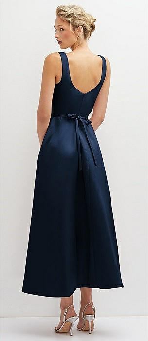 Square Neck Satin Midi Dress with Full Skirt & Pockets in midnight navy