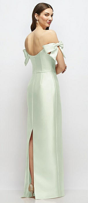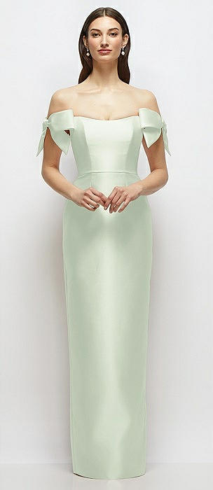 Basque-Neck Satin Column Maxi Dress with Off-the-Shoulder Bows in mint green