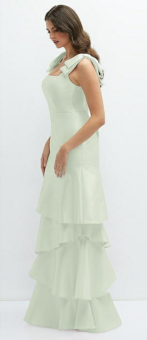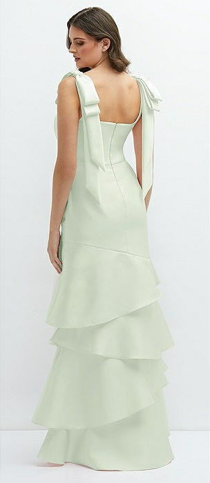 Bow-Shoulder Satin Maxi Dress with Asymmetrical Tiered Skirt in mint green