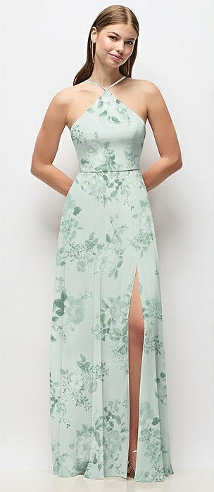High-Neck Halter Floral Chiffon Maxi Dress with Adjustable Spaghetti Straps in mint green floral
