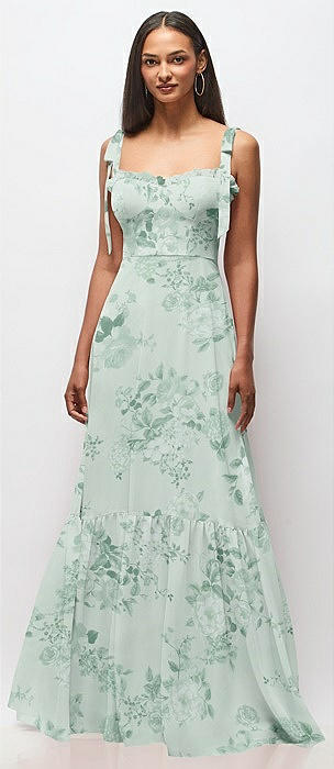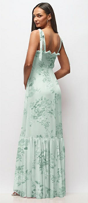 Tie-Shoulder Bustier Bodice Ruffle-Hem Maxi Dress in mint green floral