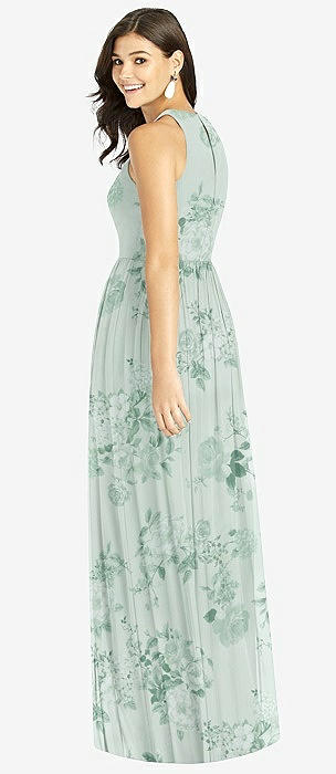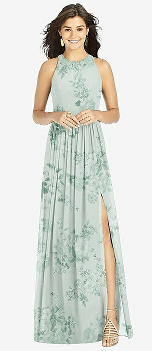 Shirred Skirt Jewel Neck Halter Dress with Front Slit in mint green floral