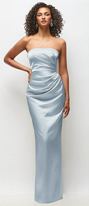 Strapless Draped Bodice Stretch Satin Column Maxi Dress in mist