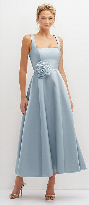 Scoop Neck Corset Satin Midi Dress with Floor-Length Bow Tails in mist