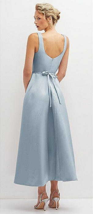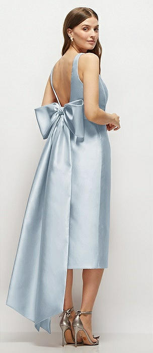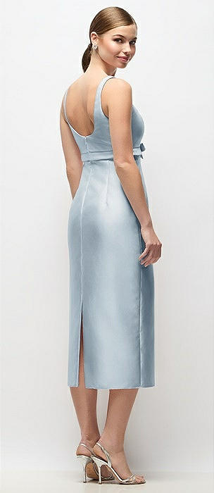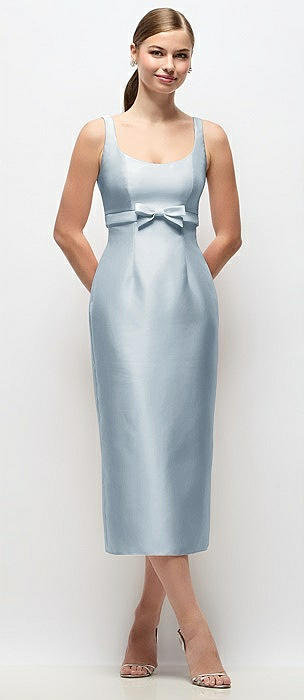 Scoop Neck Satin Column Midi Dress with Bow at Empire Waist in mist