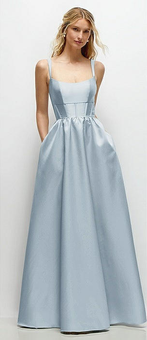 Scoop Neck Drop Basque Skirt Satin Maxi Dress with Pockets in mist